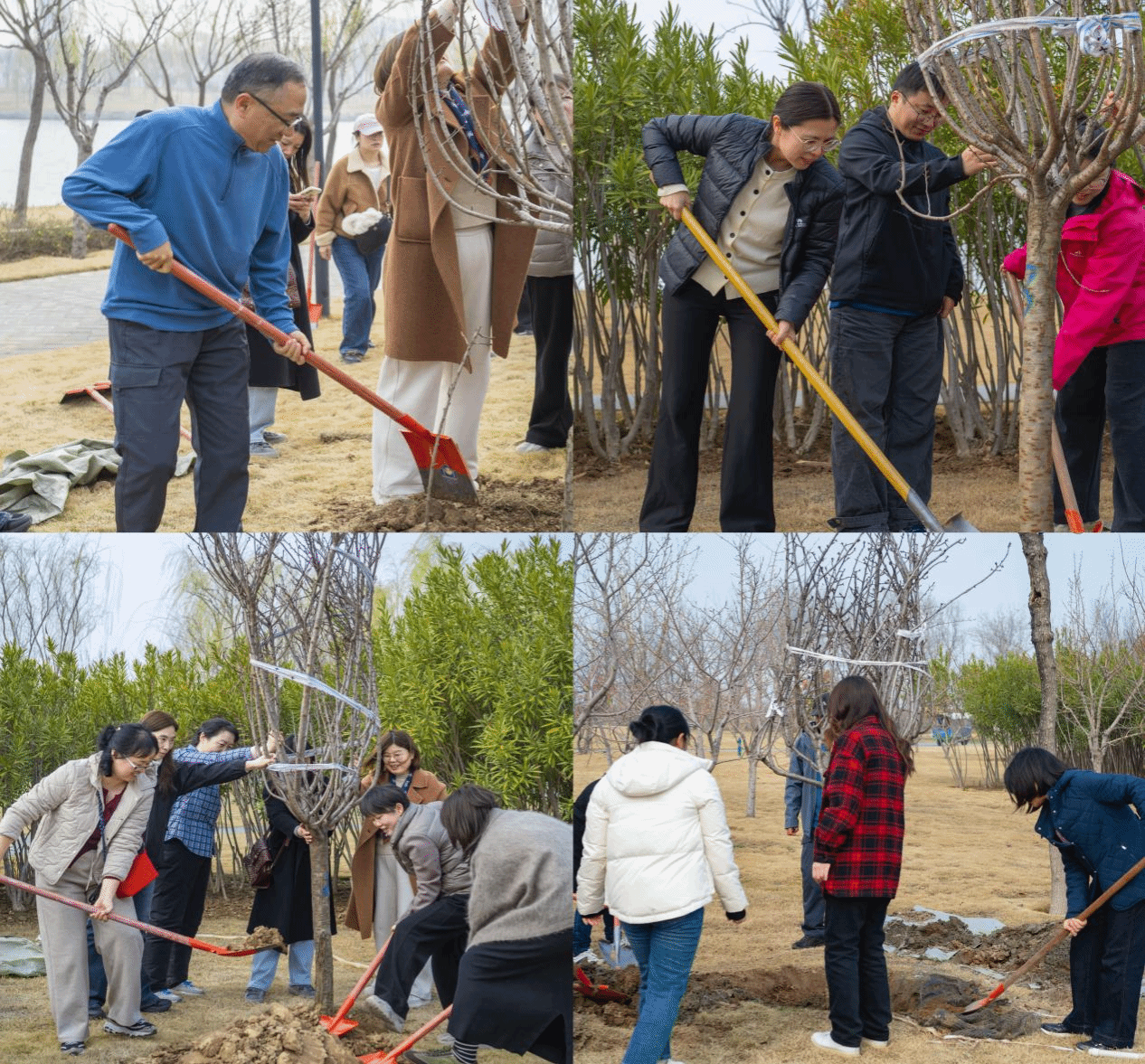 象湖公园内党旗猎猎,教职工以支部为单位分组,热情高涨、分工协作,挥锹铲土、扶苗定根、培土浇水,每道工序一丝不苟。大家以实际行动践行正确政绩观,将生态保护的责任扛在肩上,经过一番劳作,新栽晚樱迎风挺立,为春日添彩,全体教职工在新绿旁合影留念。随后,大家开展田园采摘体验活动。大棚内暖意融融,番茄挂满枝头,教职工手提采摘篮穿梭交流,在轻松氛围中放松身心、增进情谊,在实践中体会劳动价值。